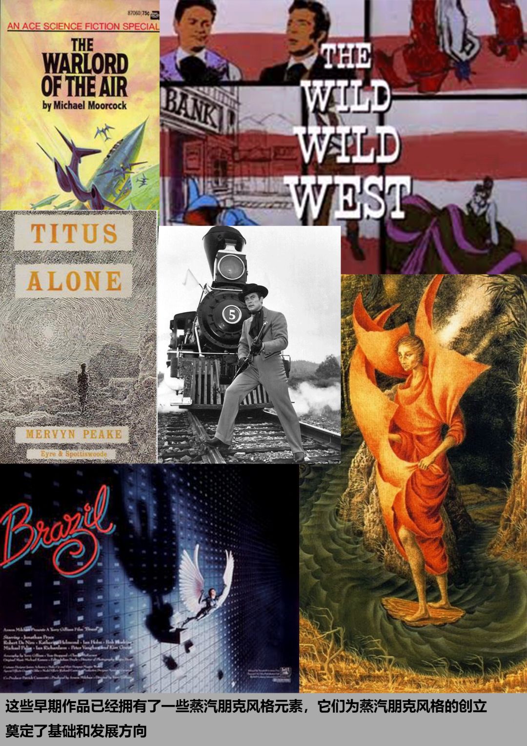 在文学方面,Mervyn Peake的《Titus Alone》(1959)被学者们广泛认同为第一部蒸汽朋克风格小说,还有人指出,迈克尔·穆科克(Michael Moorcock)在1971年发表的小说《The Warlord of the Air》便深受Peake的影响。而电影《 Brazil 》(1985)则对蒸汽朋克风格的美学特点奠定了基础。