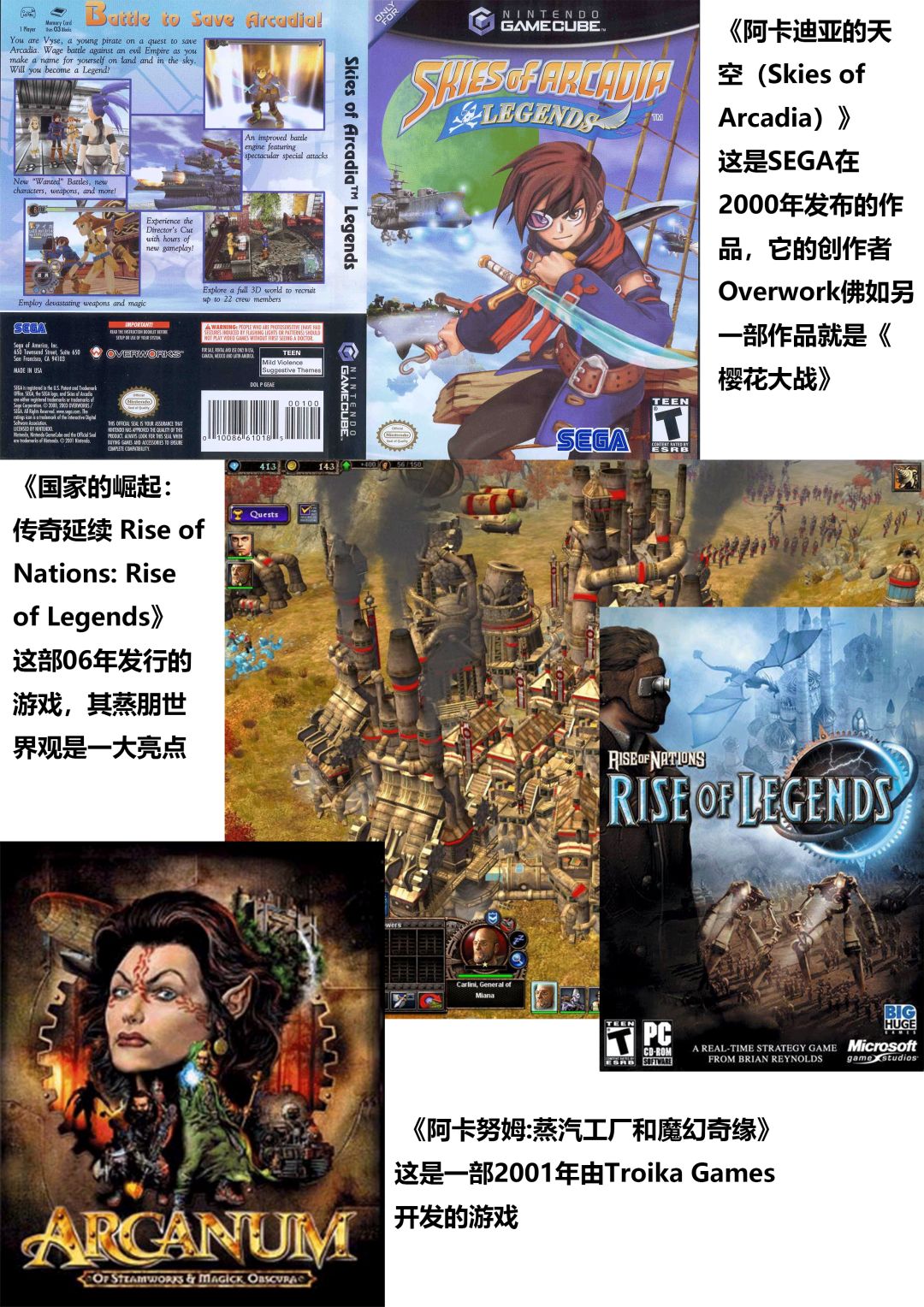 在桌面游戏和RPG游戏中,蒸汽朋克风格简直比比皆是。诸如“《阿卡迪亚的天空(Skies of Arcadia)》”,《国家崛起:传奇的崛起(Rise of Nations: Rise of Legends)》和《阿卡努姆:蒸汽工厂和魔幻奇缘( Arcanum: Of Steamworks and Magick Obscura)》。