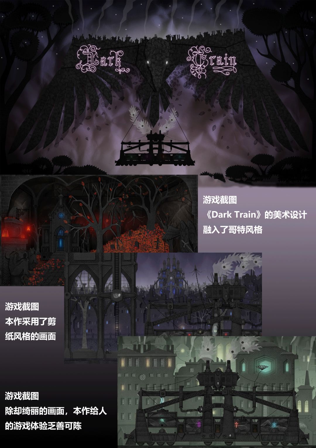 《Dark Train》就是这么一部符合“游戏维纳斯”全部特征的游戏。不过与那些唯美、奇幻、极简、超现实主义的前辈们不同,开发者为这尊“断臂维纳斯”选择的风格是哥特黑暗与蒸汽朋克的结合,在沉闷的配乐下,被剪裁的暗色纸张层层相盖,有一种别样的立体感,就像是在将残缺的雕塑摆放在不见天日的雾都街头,煤灰将美之女神染成了沉郁的灰黑色,看上去不洁,却有一种隐然雾中的神秘感。