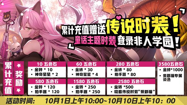 活动形式:活动期间累计充值2580五色石,即可获得晓音传说级时装“柴郡猫”,具体奖励如图。