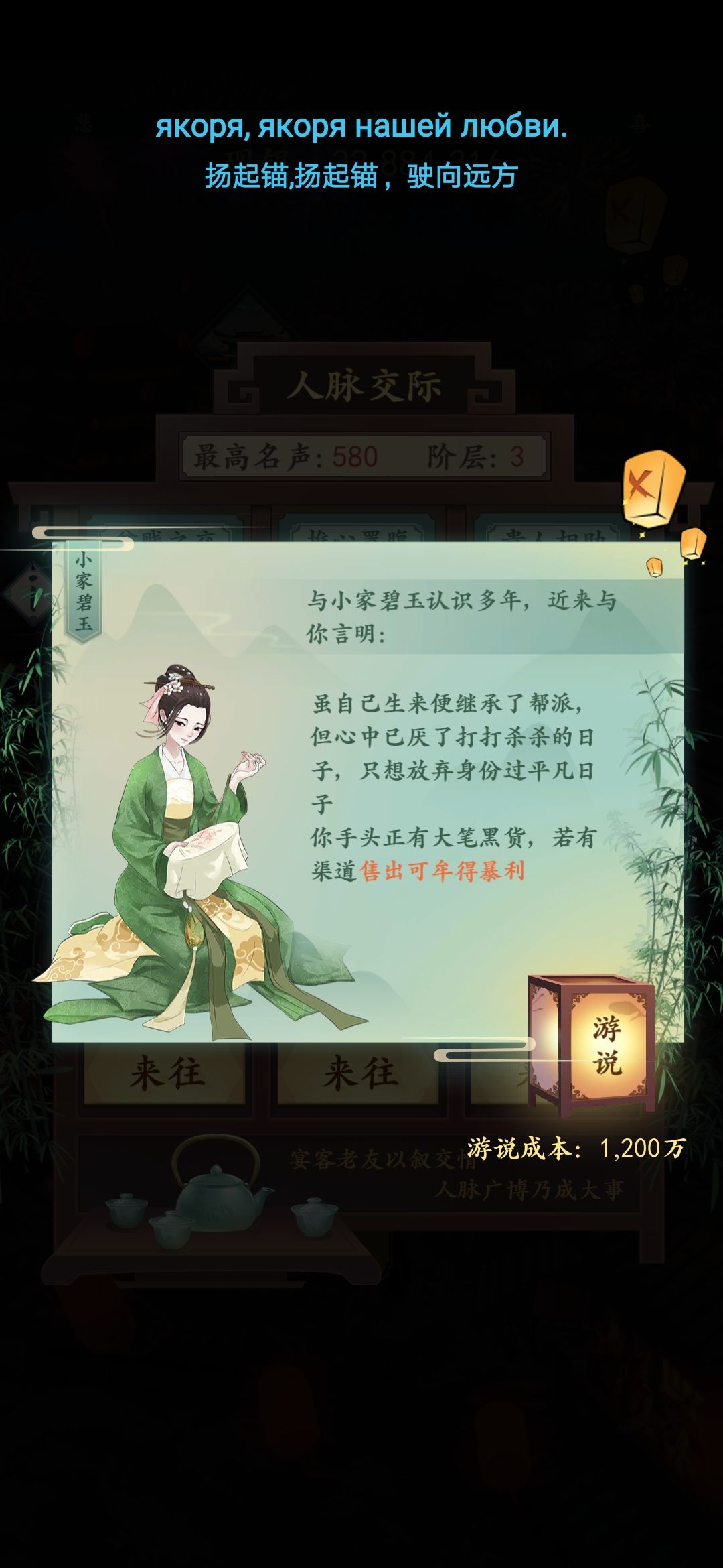 2.店铺。因为不看广告,所以就先开个字画摊,先把字花摊单升到五级。多出来的钱买卖,(有小家碧玉/大哥再凑天地人,一年就有30W,如果有花魁/南风刷上四百箱胭脂资金储备也差不多。)跟着,戏院,学宫,驿站,木匠坊,医馆都可以建起来,同时建几个视手中的钱定。初级目标都奔着七级去修。修着修着就破亿了。(ps 中后期可以空仓库赌青蛇/狐妖触发技能。前期也可以,有一次我前期招到狐妖,刚好来了仓库,空仓触发技能,又遇到首饰暴涨。南风是谁?我不认识)
