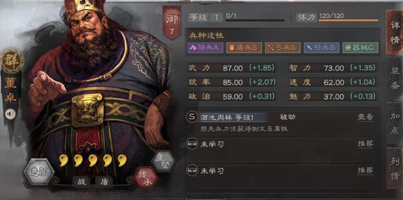 从董卓面板上的基础数值看,董卓应该是被定位成肉盾型战士。身为一个统御7的战士,其武力成长值在一众五星级武将中只能说中规中矩,而统率(增加兵刃防御能力)成长值却是蛮高的。不愧是个肉盾战士~~历史上他也是武艺超人,力大无穷~然而比起吕布,关羽之流估计还是比不过的~