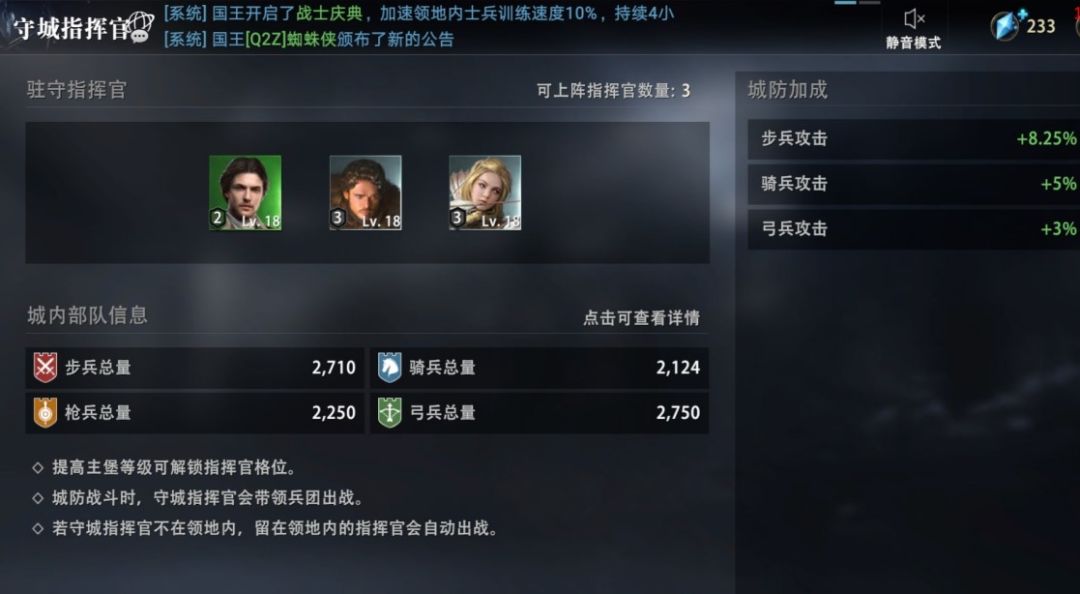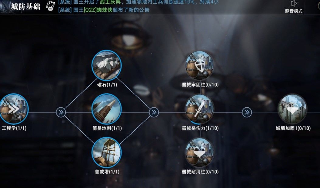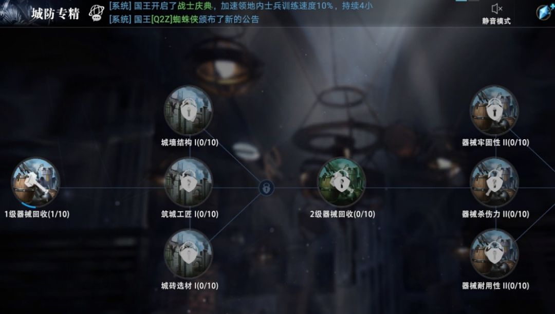 城防系统分为城防基础和城防专精,领主们可以在学士塔升级解锁该系统。