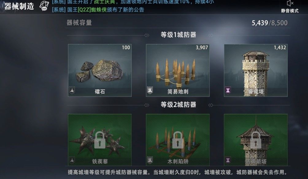 器械制造需要一定的城墙器械容量,城墙建筑等级越高,城墙的器械容器也会提高。器械制造系统对城防器械进行等级分化,需要消耗一定资源才能进行批量制造,若不想耗费太多制造时间,也可以选择消耗钻石快速完成。器械既可以制造也可以摧毁,需要领主合理制造生产。每一种防城器械都拥有一定的属性,也可能会有克制和受制的兵种。若城墙耐久度归0,城防器械会失去作用。