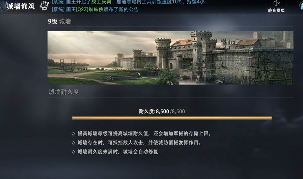 城墙修筑系统会提示城墙的耐久程度,城墙建筑等级越高城墙耐久上限越高。若城墙耐久程度未满时,城墙会自动修复。