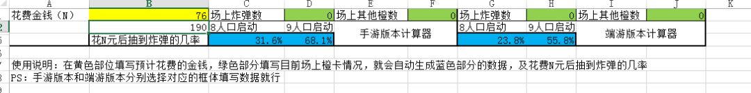 在黄色部位填写预计花费的金钱,绿色部分填写目前场上橙卡情况,就会自动生成蓝色部分的数据,及花费N元后抽到炸弹的几率 非常的简单
