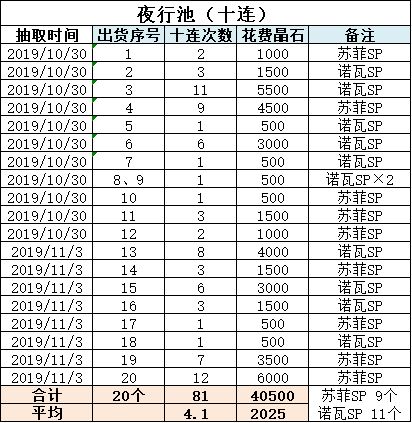 40发十连,共花20000石,出货12个,其中苏菲SP5个,诺瓦SP7个。