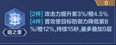 NO.4暗之章:暗代表着毁坏,代表着腐蚀,首先两件套触发特效为攻击力提升百分比,四件套触发特效为普攻使目标防御低降低8%/12%持续15秒并且最大可叠加5层,首先第一个特效加攻击不错,还是那句话只要是加攻击的徽章都不会差到哪里去了,第二个特效初始一看我去好变态的说只拿紫色来说5*8=40也就是说如果你和对面打斗持续到了1分多的时候将会直接对他消减将近一半的防御,那么6个人一起带是不是就是上场就可以将对面直接消减6*8=48防御那?,因为我正好有那么两套暗之章所以索性做了一次实验,在浦原的考验-甚太的秘密那里 我上了两个带暗之章的角色、然后战斗开始了,过了15秒我就失望的发现不管你是几个人带暗之章触发的都是一个特效,因为咱们游戏如果是不同的眩晕不同的技能如果触发在对面身上,他的头上都会出现一个独立的图标例如蓝染的眩晕和空鹤的短暂眩晕还有大前田的眩晕,最高的时候我做过实验对手的头上出现过3-4个眩晕图标,然而我测试暗之章时、从头到尾都是一个,所以最后此徽章只能从一个变态徽章沦为一个较为强力的徽章。