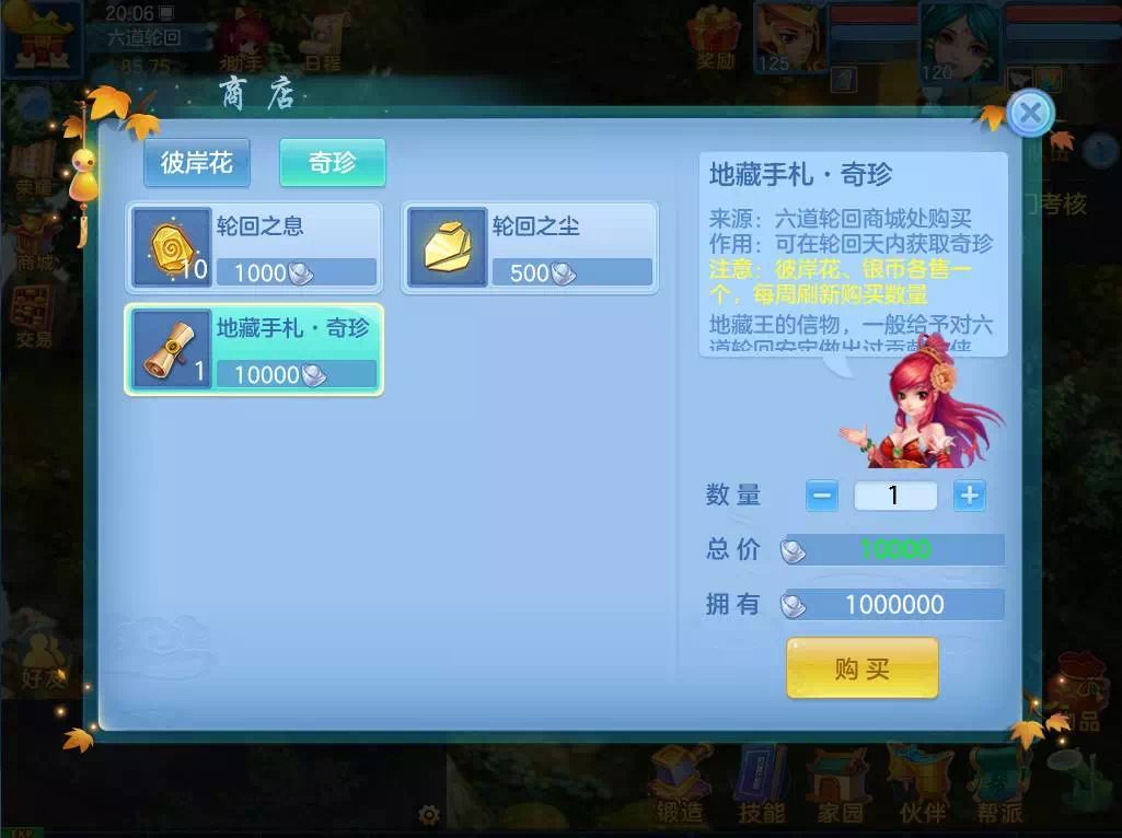少侠们可以去六道轮回的地藏王处购买地藏手札以获取奇珍。每周可以用彼岸花和银币各买1个,共2个。也可以购买轮回之息对奇珍进行升级,轮回之息的数量每天都会刷新。