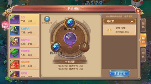 宝石分为1~10级,高一级宝石需要3个低一级宝石合成,且4级以上的宝石在合成时还会额外消耗道具【幻想之星】。虽然低级宝石可以合成高级的宝石,但是由于宝石整体的价格还是比较便宜的,并且只需要购买一次,因此建议各位玩家可以直接购买最高级的宝石进行镶嵌。
