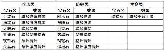宝石一共有13种。只有已装备的装备的镶嵌宝石属性才是有效的,给背包中的装备镶嵌宝石不会提升角色能力,同时镶嵌有宝石的装备无法直接进行出售、分解、回收、上交等操作(拆掉宝石才可以)。