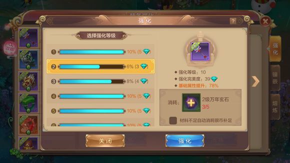 有所区别的是,手游幻想的加工材料更为细致,将万年玄石进行等级划分。每个等级也单独拿出进行加工。1级强化消耗1级万年玄石,2级强化消耗2级万年玄石……以此类推。万年玄石可以直接通过银币或元宝向系统购买,因此小伙伴们也是可以通过不断努力来达成强化的。每次强化可随机强化2%~10%的基础属性,分别对应1~5钻,每钻代表2%。对的,也就是说,小伙伴们再也不用担心强化失败掉级之类的事情了。(测试过程中,完美强化5钻的概率还挺大的,至少有10%以上)