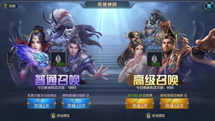 提升战力、出征、攻打以及防御都离不开英雄,在我的王朝中,英雄的主要来源是英雄神殿召唤,神殿召唤又分为普通召唤和高级召唤两种,普通召唤每天免费次数为5次,高级召唤免费次数为1次,第二天恢复免费召唤次数。当然啦,如果主君迫不及待要召唤新英雄,可以用点券进行召唤。