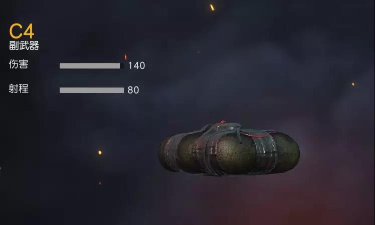 C4炸弹的伤害数据是140,射程80米,也就是说,C4炸弹只能在80米之内被引爆,超过80米将无法被遥控。相比较于破片手榴弹而言,C4威力更强、射程更远。而且根据补漏王被炸多次的经验,C4造成的伤害也不会受任何护甲影响,行走在荒野,踩雷需谨慎。