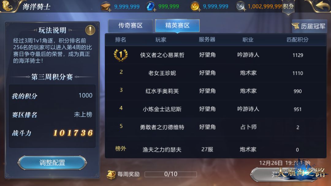 作为一场跨服竞技赛事,全新来袭的“海洋骑士”玩法,将分为精英赛区和传奇赛区在全服展开。赛事总计持续4周,前3周为积分匹配周,第4周为淘汰赛周。