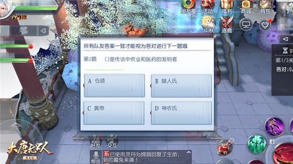 玩家小队首先需要前往月桂树下和吴刚进行对话答题来打开广寒宫大门,在每回合答题里队伍中的所有小伙伴均要选择出正确的答案,答对3题之后可以进入月宫,如果不幸答错则会受到“月宫的诅咒”:在广寒宫中活动时玩家攻击力和血量上限均会下降。如果对自己与伙伴有着绝对自信,不妨来体验一把挑战不可能任务的刺激。