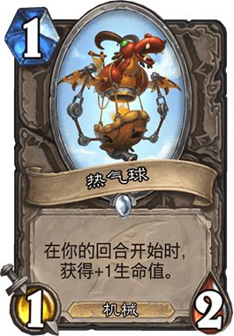 热气球这张卡对于机械猎来说可谓是雪中送炭,以前机械猎的1费就只有机械袋鼠,先手抓不到的话就只能空过了。热气球身材扎实,还有高贵的机械属性,1费上的话buff一下就很强。