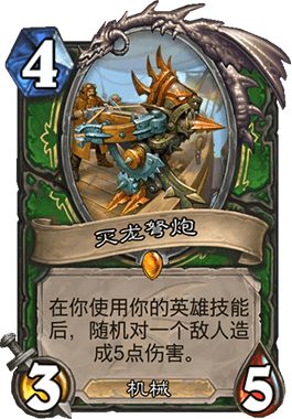 灭龙弩炮这张卡纯粹是因为我开到了就带上了,虽然预览的时候外国主播普遍给了很高的分,但是我实测了并不是很适合机械猎,反倒是宇宙猎可以考虑带,首先5血就很容易被解,要是像萨满的436一样就不错,而且这个随机真的很坑,每次都打在对面11身上,可能是因为我脸黑吧