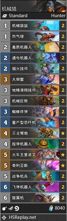 与上个版本的机械猎相比,这个版本加入了4张新卡,分别是热气球、灭龙弩炮、地精滑翔技师和旋翼机,与那些动则万尘的卡组相比,机械猎的造价还算是便宜的,仅需8k尘,比较适合平民和萌新![[嗒啦啦2_吃瓜]](https://img.tapimg.com/market/images/6eb1d083dff1c09692102cb5a98727f3.gif)