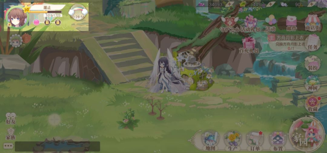 下方的四个按钮分别是地图、生产、订单、布置,其中地图点击后能后切换到其他场景中,订单就是收集材料给到需求材料的NPC后完成订单能获取奖励,布置功能能直接在地面上种植花种,并且还能把家园场景中所有可移动的装饰移动位置。