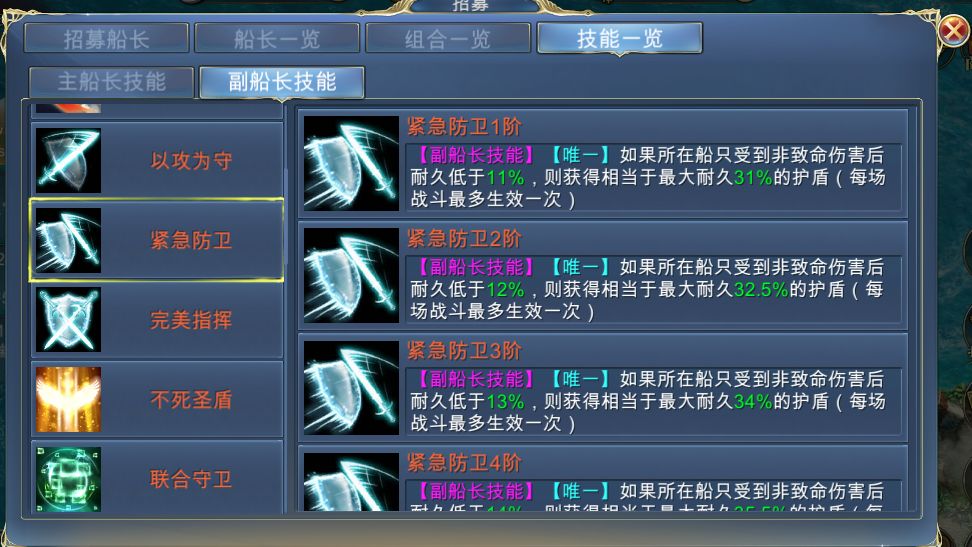 [紧急防卫]技能也是根据自身船只的最大耐久增加,不仅能在船只耐久极低的情况保命,还能增加逆风翻盘的几率呢!