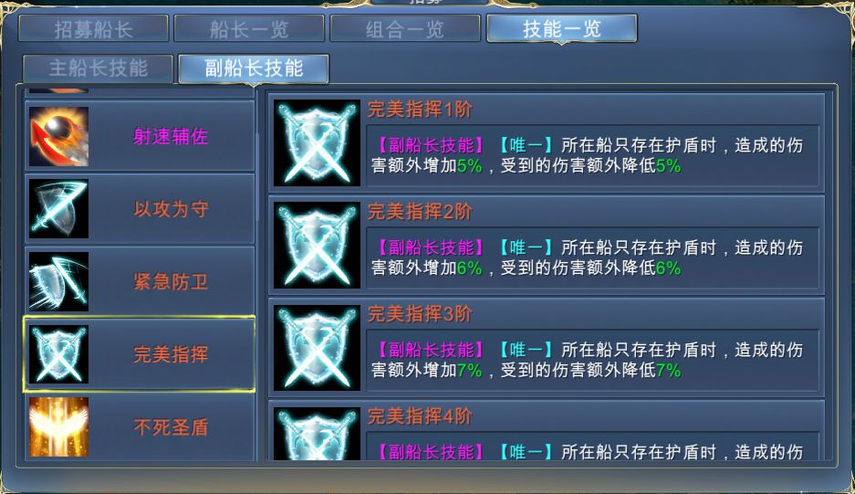 [完美指挥]——所在船只存在护盾时,对敌方舰船造船的伤害会额外增加,受到的伤害也会减少。