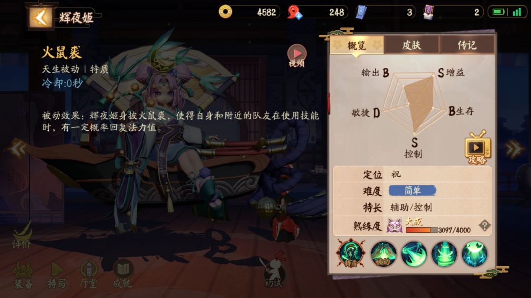 被动效果:辉夜姬身披火鼠裘,使得自身和附近的队友在使用技能时,有一定概率回复法力值