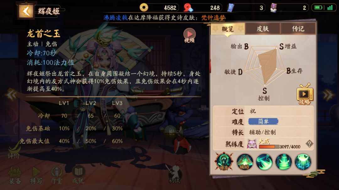辉夜姬祭出龙首之玉,在自身周围凝结一个幻境,持续5秒,身处幻境内的友方式神会获得10%免伤效果且免伤效果会在4秒内逐渐提高至40%