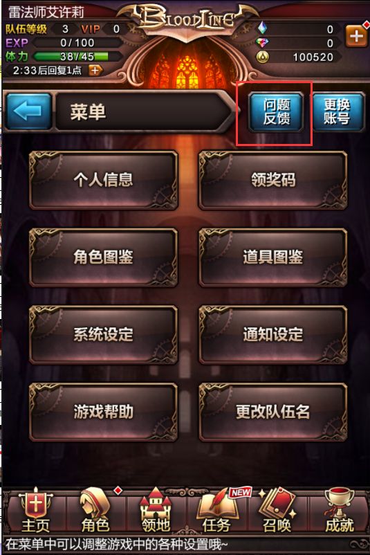 ② 完成新手引导后,点击游戏内菜单->问题反馈->问题提交,进行账号迁移申请。