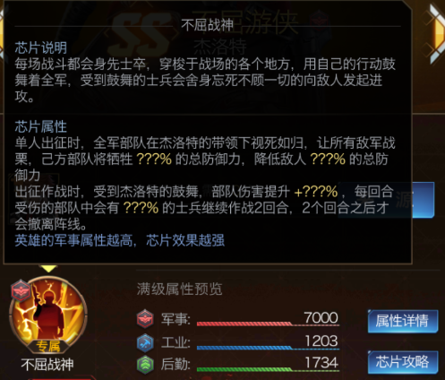 根据官方对这名英雄的定位解读,笔者认为,这名英雄应该是有点类似游戏中的另一位SS级英雄“所罗门”,众所周知,所罗门的专属技能“超时空援军”能够在战斗时召集更多的援军加入战斗,而“杰洛特”似乎也有类似功能,根据游戏中资料显示,杰洛特的专属技能“不屈战神”会在出征作战时,每回合受伤的士兵都有几率一定比例在下次战斗时重返战场,也就意味着,在战场上,大大的提高了部队整体的续航能力。而其专属技能另一属性:单人出征时,己方部队将牺牲一定比例的总防御力,降低敌人一定比例的总防御力,也有点“杀敌一千,自损八百的”的意思。虽然说这个属性有点不那么完美,但是结合前面的属性的话,综合来看,却是有点敢死队的感觉,因为降低自己防御,己方虽然死的多,但是自己有一部分部队能够返场再战,而敌方却不能,这就是优势,这就是这个英雄比较独特的地方。