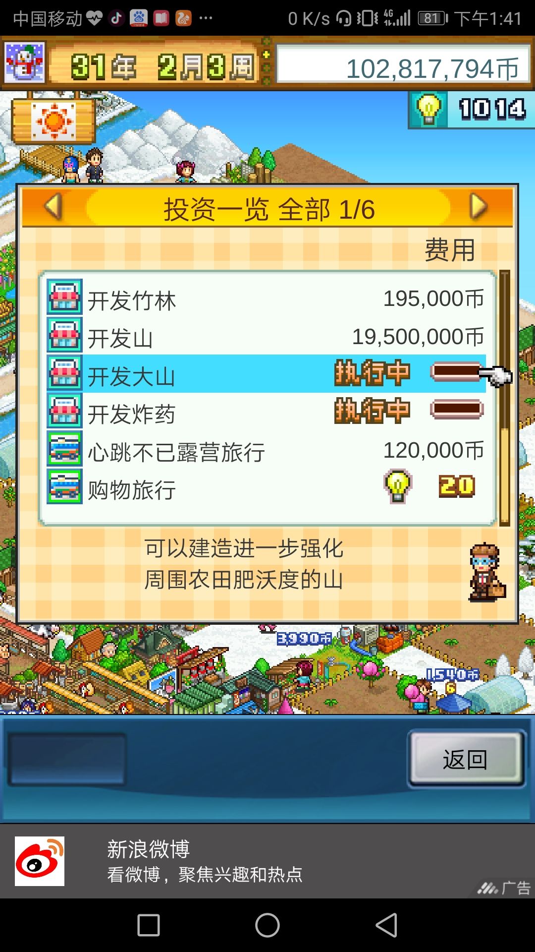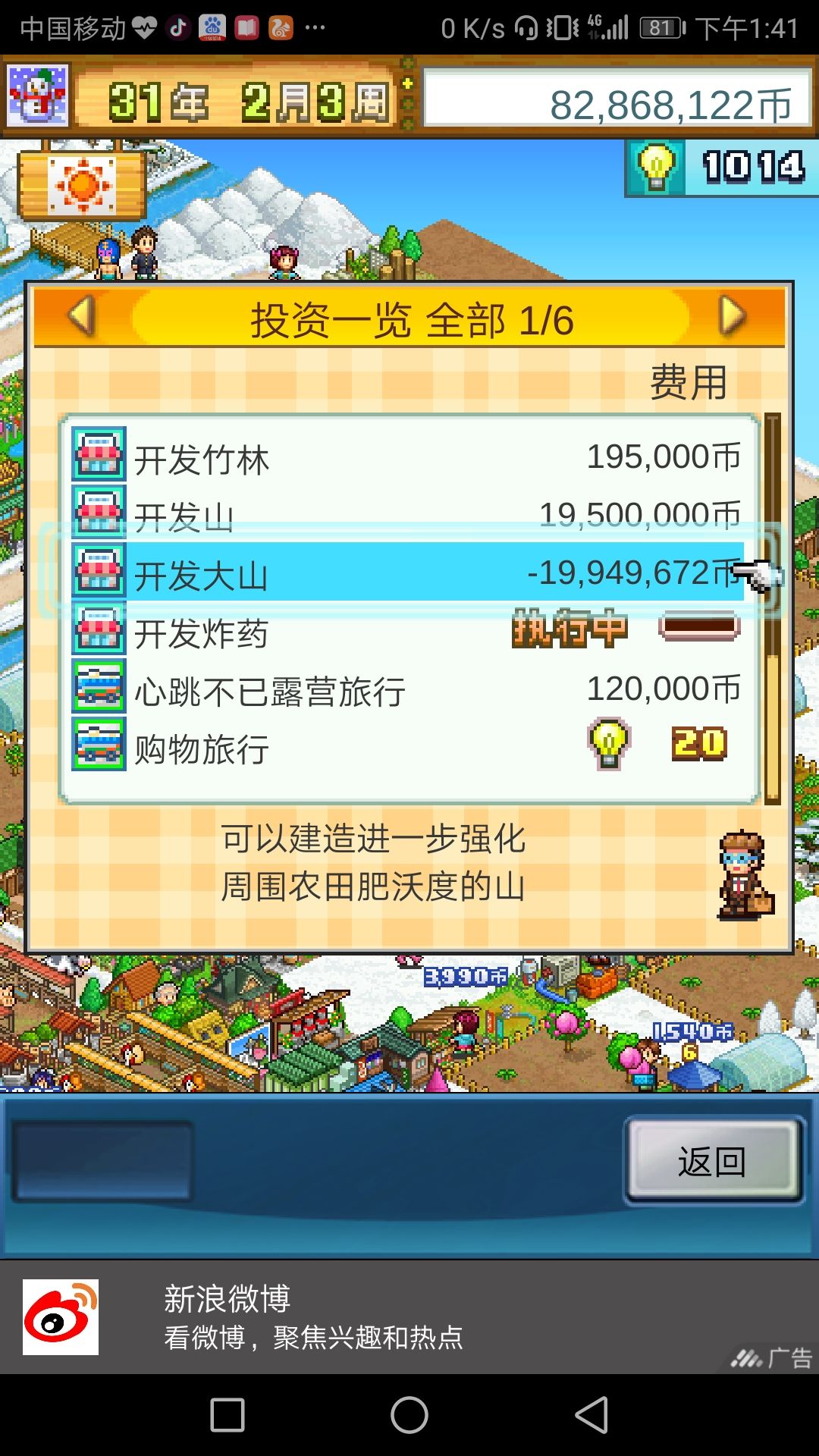 我根据网上大神的布局图玩的,所以弄了很多大山,后来点开投资,发现大山价格是负的