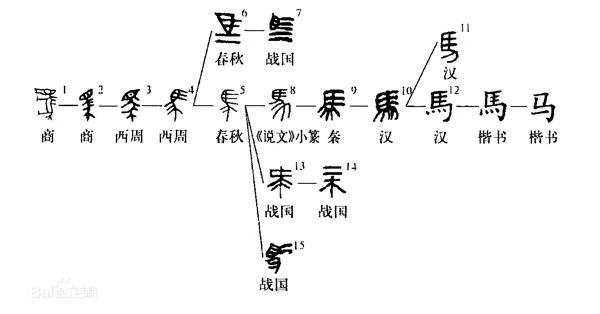 象形字。甲骨文(图1、2)的“马”像马的侧视形,头尾四足俱全,头颈部的鬃毛是它的特征。周代相继出现了如图3(毛公鼎)、图4、图5的金文,与甲骨文的形体相比,笔画有所减省,但基本保留了大眼、修尾、长鬃的特点,望形还可知义。