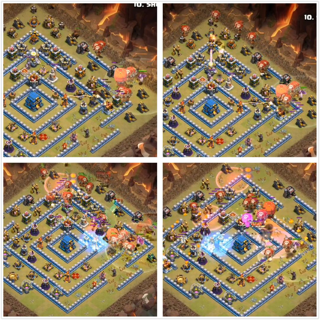 女王死之前把刚才看到的电磁塔打掉了,这足以证明满级女王是多么强悍!那么在下狗的时候为什么先从3点方向下狗球呢?我们可以仔细研究一下,如果先从12点下,那么肯定12点周围的防御建筑会先被打完,打完之后,3点方向的狗球就不知道会清理防御到什么程度,因为本身3点这里的电磁塔都被消灭了,没有引走气球的建筑,那么这一带下的狗球会直接往内圈进攻,尤其是大本营这里,至少有一部分是进到里面的。所以这样安排就保证了12点方向的气球不会被中圈大本营引走太多,那一路的气球会直接沿着边线进行轰炸。因此狗球是很讲细节操作的,并且如果刚才的电磁塔若没消灭,我们在下球的时候也是从这个位置下,并且会提前一些时间放几个气球去炸电磁塔,这样也是为了保证气球后边的大部队不会跑偏。