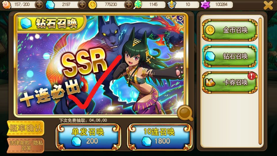 2.新手教程都有跳过功能。特别是第一个技能指导的场景一定要直接退出。。不然要打半天。。然后大概2分钟可以弄完新手教程。签到拿钻石,教程通关第一关主线任务拿钻石。203个到手。叫上免费的一发可以抽2次哦。。