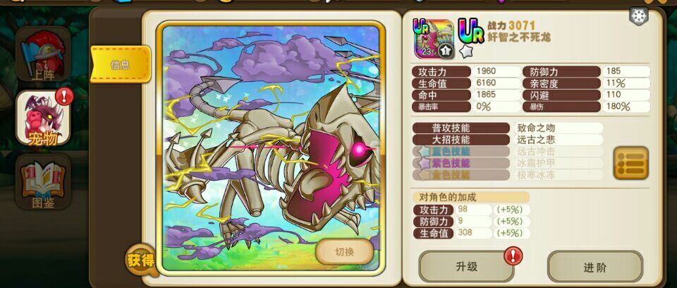 片面来说宠物培养有升级和进阶2个。。等级越高,阶位越高,品质越高(R,SR,SSR,UR)SSR里面还有品质差别就越厉害。