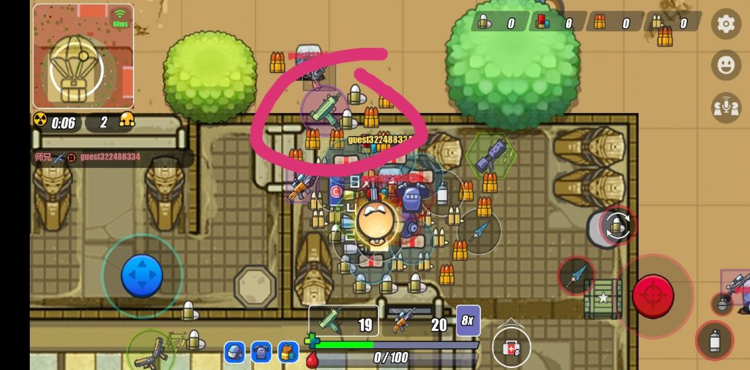 想吃鸡的话,首先得避免车轮战。这2D吃鸡地图跟3D吃鸡比起来,小太多了,太多太多了,然后缩圈也快了很多,但是人却少不了多少。这导致什么,就是游戏节奏加快。你想吃鸡,首先枪法要好,因为你落地就会碰到人,注意,这游戏还是没跳伞这功能的,是直接给你随机刷的。但是!打药速度太慢了。打最大的药包还行,或者是那个大的饮料。