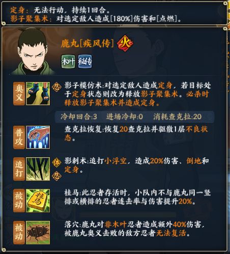 鹿丸的 奥义“影子模仿术” 虽说冷却为3回合,但却具有首回合释放、定身和影子聚集术180%高伤点燃的优势,从整体来看,鹿丸奥义还是非常不错的。