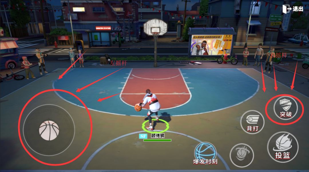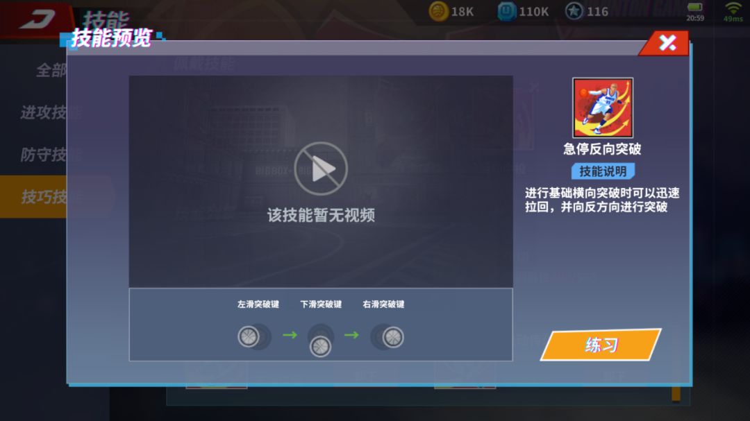 比如急停反突破这个技能,就是在面对篮板的时候,使用左滑右摇杆,然后下滑右摇杆,最后右滑右摇杆来完成。这边说的上下左右是球员正面对篮板的时候,球员的左手边计算的。