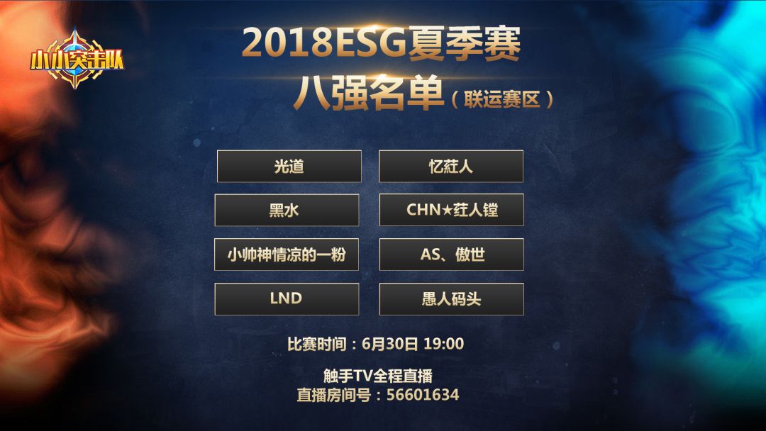 在上周六(6月23日晚),经过一晚上激烈地角逐,《小小突击队》esg夏季赛的8强战队出炉,让我们恭喜这八支优秀的战队!之后的比赛更为精彩!