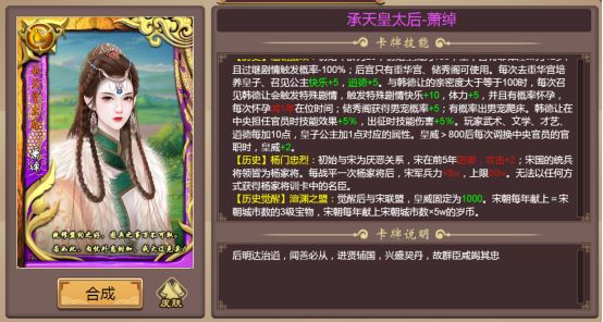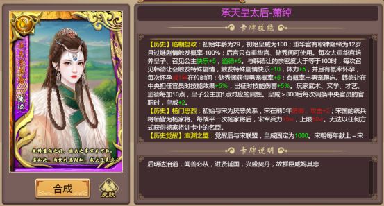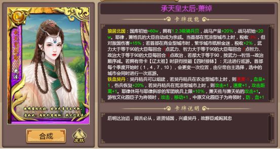 萧绰,小字燕燕,原姓拔里氏,后被赐姓萧,出生于重臣之家,被辽景宗封后。设定了【狼居北国】、【铁血契丹】技能,其独特的出身背景,赋予军团不俗的作战能力。