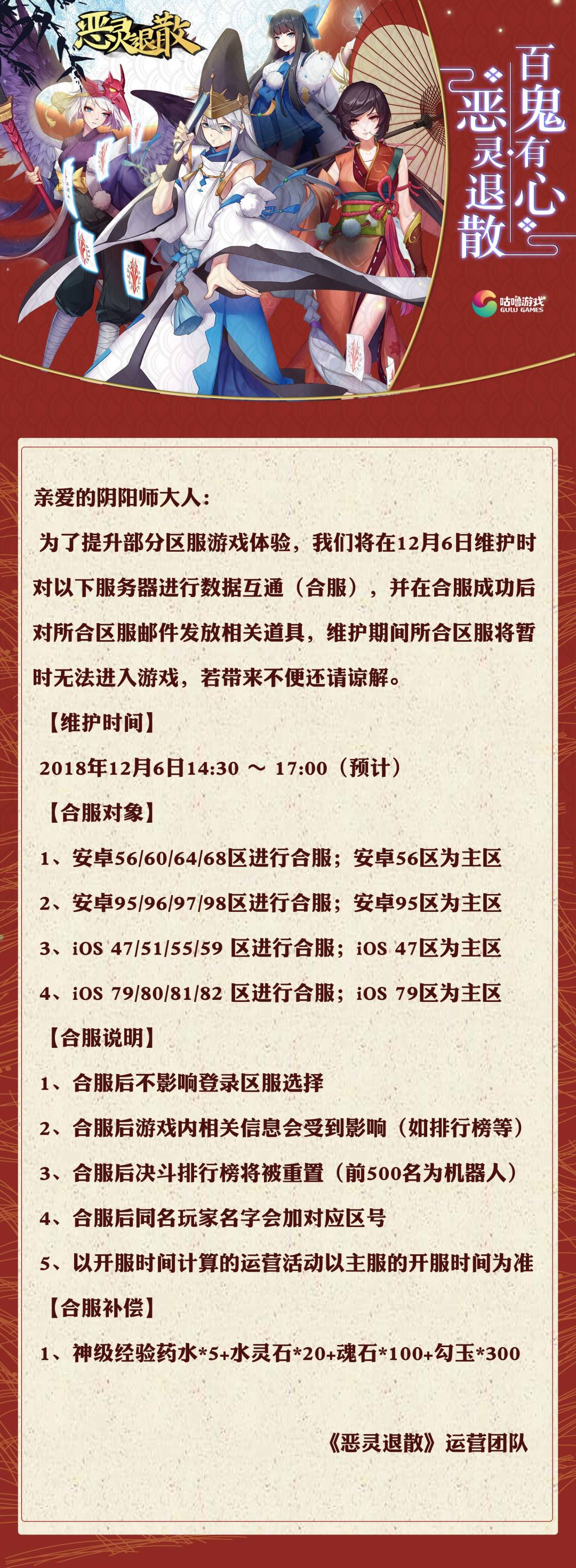 为了提升部分区服游戏体验,我们将在12月6日维护时对以下服务器进行数据互通(合服),并在合服成功后对所合区服邮件发放相关道具,维护期间所合区服将暂时无法进入游戏,若带来不便还请谅解。