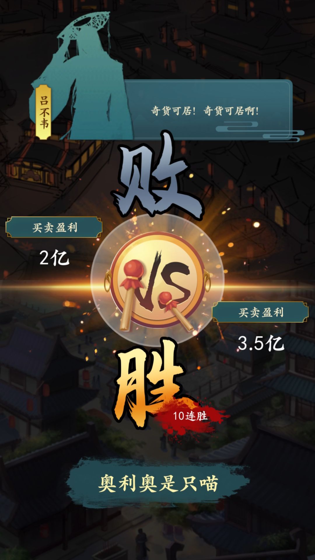 评价:中后期总是忘了去经营买卖。。。买卖一波的盈利一般也就千万级别,吕爷一般都是3亿出头!注意买卖别到了中期就停止操作的话,基本还是能赢,赌到一次满仓🐴的话(按1000仓库算)就是必胜了;