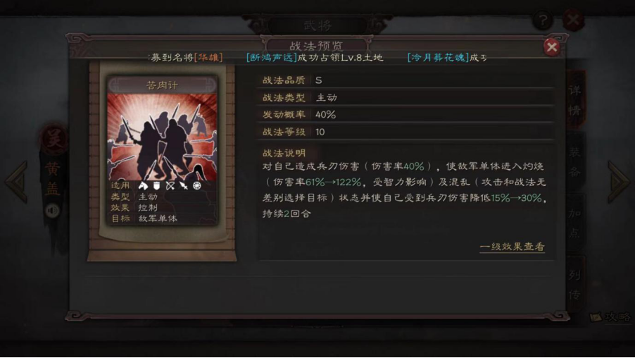 鉴于黄忠自带战法的25%会心特性,可以考虑携带提升会心概率的战法,从而提升黄忠的输出稳定性。能够提升会心几率的战法主要有:西凉铁骑、左右开弓、猛击。