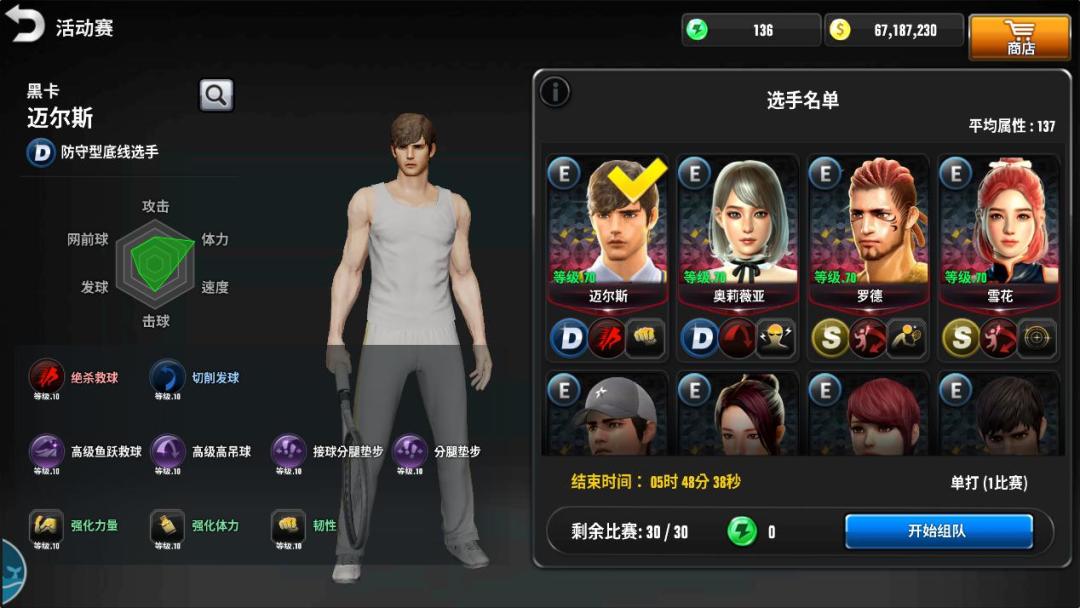 新增最公平的竞技模式-公平竞技场。公平竞技场是周末限时开放活动,开启后玩家需要使用游戏币报名参加最多30场比赛,无论输赢都可以赢得丰厚奖励。公平竞技场最大特色是竞技场内提供的14位黑卡球员进行比赛,这14位黑卡球员属性和技能等级相同,给你最公平的网球竞技体验。