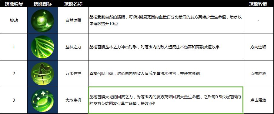 Gank:桑榆基本没有Gank能力,但是多样化的控制和回复手段可以有效的保护我方下路不被Gank。