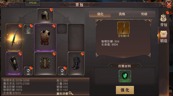 1. 装备强化:只有穿戴在身上的装备,才可在锻造-强化界面中,消耗所需材料进行装备强化,强化后装备属性可得到提升。