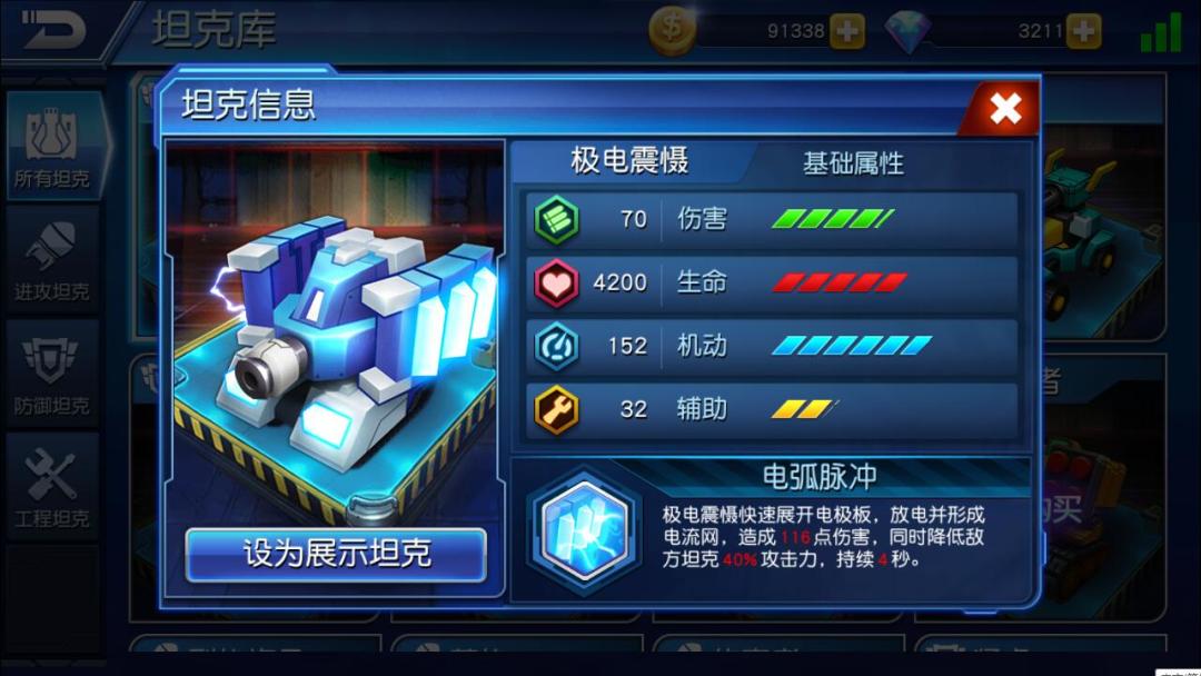 极电震慑的伤害和机动能力是防御坦克中最高的,其中机动能力并不亚于一些攻击坦克。在防御坦克这一甲厚体重的特性里,极电震慑算是身姿比较轻盈的了(。・ε・。)极电震慑的技能是“电弧脉冲”,在周围形成电流网,对电流网范围内的敌方坦克造成伤害。极电震慑的各项技能属性都属于中上,性价比很高。