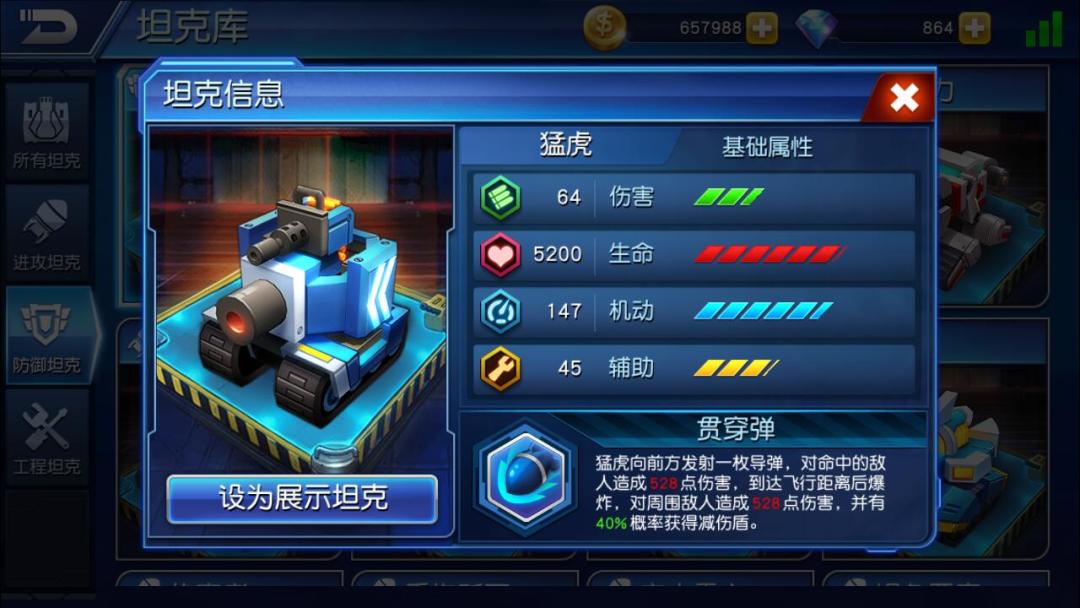 猛虎。猛虎的技能是“贯穿弹”,向前方发射导弹,导弹飞行指定距离后爆炸,对命中和在爆炸范围之内的敌方坦克都造成伤害。猛虎的防御属性并不是体现在生命值上,而是在发射技能之后有一定的概率获得减伤盾。