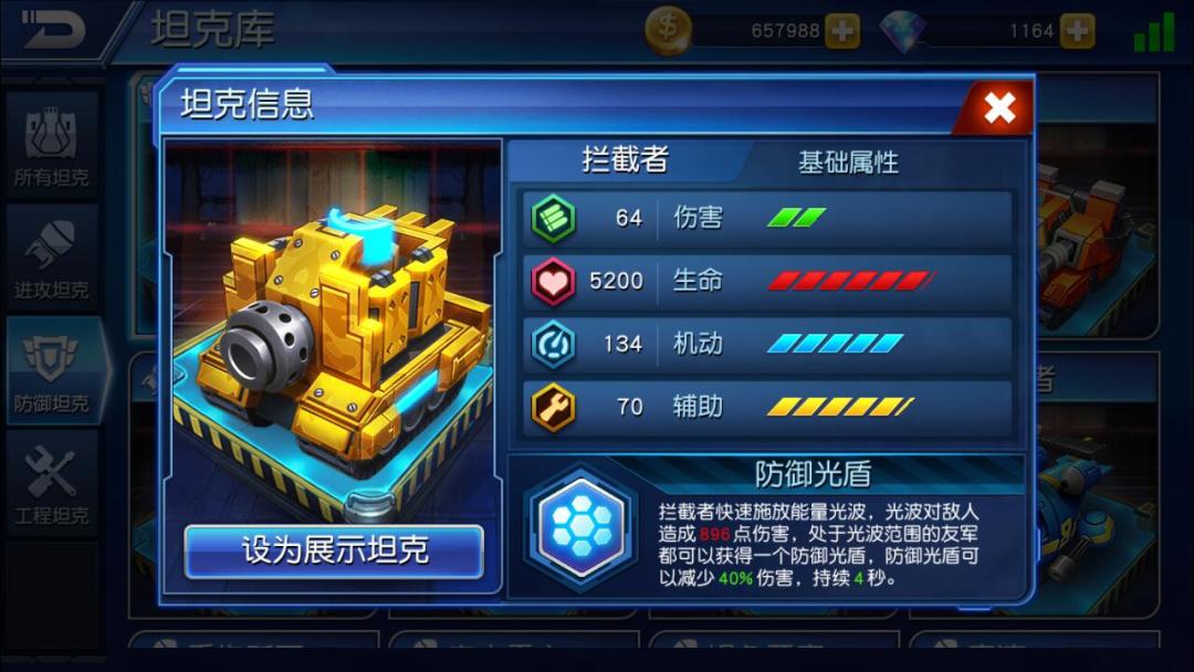 拦截者算的上一辆货真价实的主打辅助的坦克,是最符合甲厚体重这一特征的防御坦克。拦截者的技能是“防御光盾”,在对敌方坦克造成伤害的同时,会对光盾范围内的友军施加一个防御光盾。