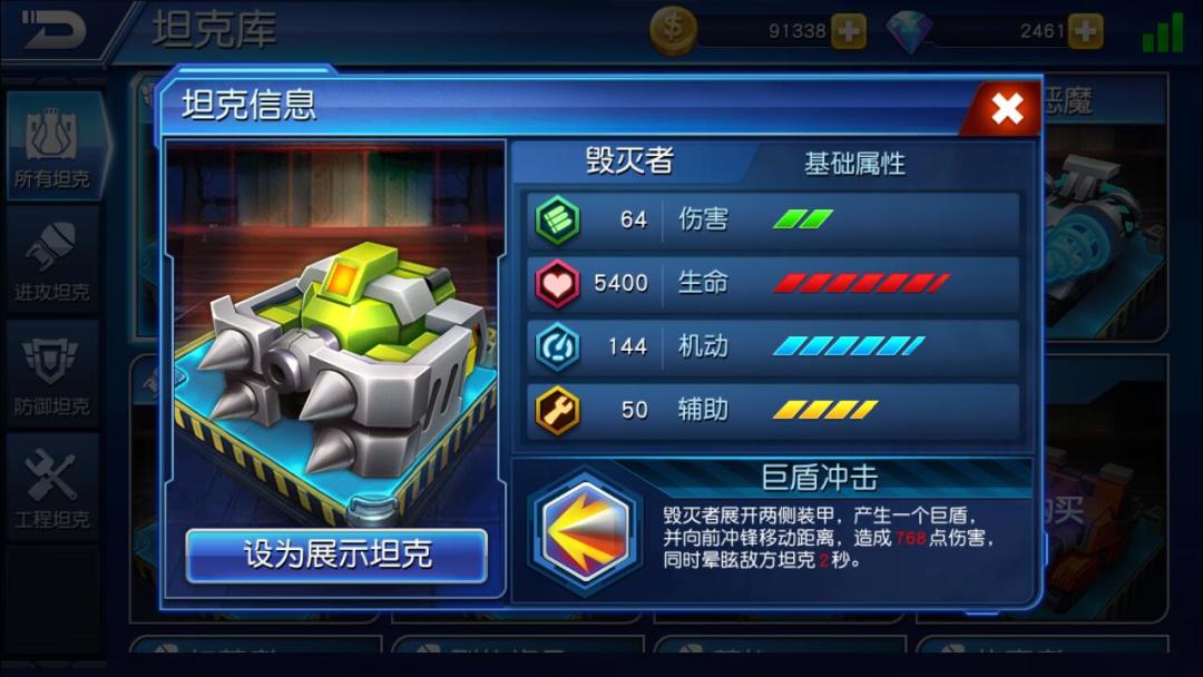 毁灭者属于最标准的防御坦克。生命值在所有坦克中属于数一数二的。毁灭者的技能是“巨盾冲击”,可快速向前移动一段距离并伤害敌方坦克,同时对敌方坦克产生晕眩效果。这也是一辆偏重辅助的坦克,在对战过程中,为队友争取宝贵的时间。